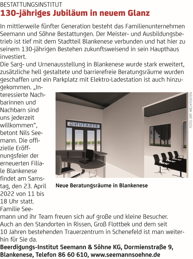 Nicht nur Kommunen können richtungsweisende architektonische Projekte realisieren und auf den Weg bringen. Auch im Kreis unserer Bestatter finden sich immer wieder herausragende Projekte, die weit über den Raum der jeweiligen Region hinausweisen. Ein Trauerzentrum besonders exquisiter und ansprechender Art entsteht in diesen Monaten unweit von Hamburg-Blankenese im angrenzenden Schenefeld, Landkreis Pinneberg. Nils Seemann wagt mit seinem renommierten Bestattungshaus Seemann&Söhne in Hamburg neue Wege zu beschreiten. ...mehr